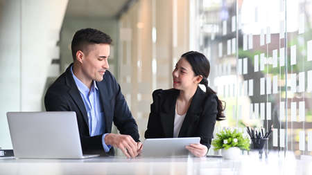 Asian and caucasian ethnicity partnership businesspeople discuss a business plan together in the meeting room in office. Co-worker colleague and teamwork concept.