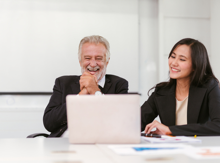 elderly Businessman and business woman sitting in a meeting and checking documents and notebooks on a desk in a meeting room.