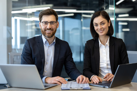 Smiling man and woman in formal attire working together on laptops in modern office setting. Image highlights cooperation, professionalism, and successful teamwork during business meeting
