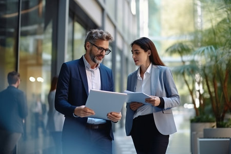 Experienced businesspeople walking through office corridor and talking. Professional grey-haired CEO in eyeglasses discussing with brunette middle-aged businesswoman. Business and management concept