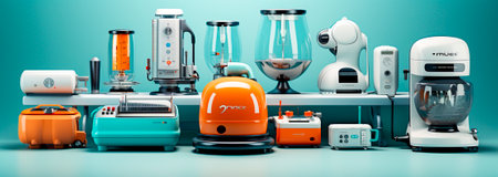 Electric kitchen appliances and utensils for making breakfast on blue background. 3d render of kitchenware for cooking, baking, blending and whipping