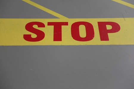 Stop sign written in red letters with yellow line on gray ground