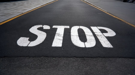 A striking stop sign painted in bold white on a dark asphalt road surface, emphasizing the importance of traffic rules and safety for drivers and pedestrians alike.