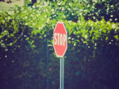 Vintage looking Stop traffic sign over lush greenery background