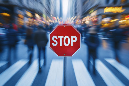 stop road sign against the backdrop of blurred hurrying people on a city street