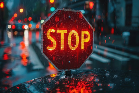 This image showcases a bright golden STOP sign against a dark background, highlighting safety and caution. The reflective surface adds depth and allure.