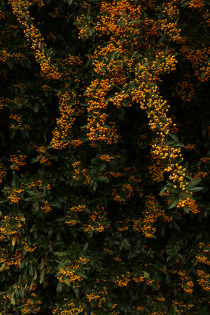 Pyracantha bush with vibrant yellow berries and deep green leaves creating a striking contrast. Nature during the autumn season. Cotswolds, England