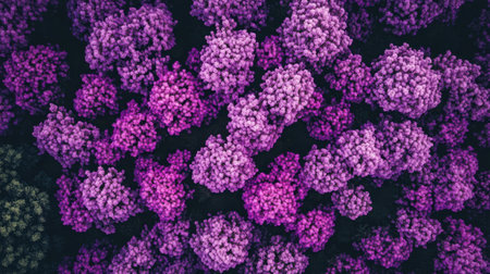A breathtaking aerial view of vibrant purple flowers blanketing a rich green landscape. This enchanting scene captures the essence of springtime beauty.