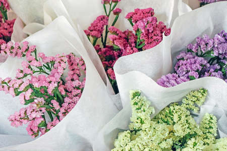 Bouquets of white and purple statice flowers at the market close up. Beautiful floral background. Top view.Selective focus