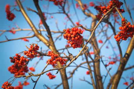 Branches of mountain ash (rowan) with bright red berries against the blue sky background