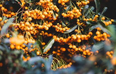 Rowanberries sour but rich vitamin C. Pyracantha plant, also known as firethorn in a garden in a sunny autumn day, beautiful outdoor floral background photographed with soft focus