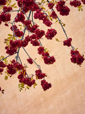 Autumn season. Fall harvest concept. Autumn rowan berries on branch. Red berries and leaves on branch close up. Branch of ripe berries mountain ash grows on a tree.