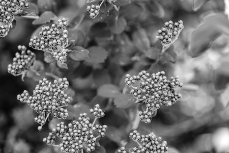 branches and bunches of abstract wild prickly flowers closeup in the foreground and on an indistinct background monochrome tone