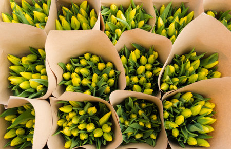 Beautiful bouquets of yellow tulips in craft paper, spring flowers of floriculture. Selective focus.