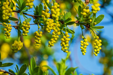 European Barberry (Berberis vulgaris) in garden.Yellow flowers and buds cluster on blooming Common or European Barberry, Berberis Vulgaris.