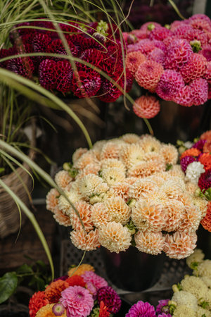 A vertical shot of Dahlia bouquets in pastel colors