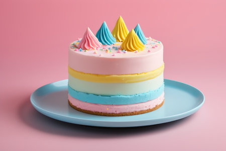 An AI generated illustration of an appetizing baby cake in pastel colors with figures and sprinkles