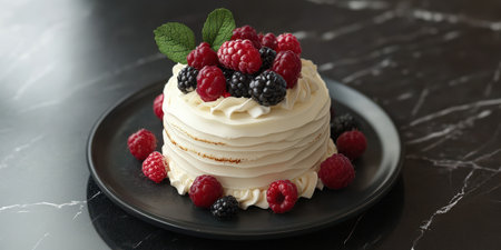 Delicious layered cake topped with fresh berries and mint on a dark marble table
