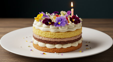 A delightful birthday cake featuring fluffy layers, creamy frosting, and colorful sprinkles, elegantly displayed on a cake stand, perfect for celebrations.
