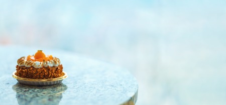 sweet cake on desk with laptop in background, copy space