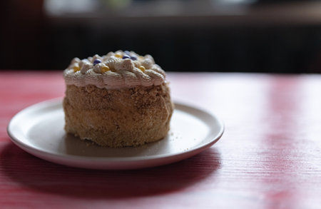 Slice of tiramisu bento cake. Presentation of cake in section. Sweet dessert for one person. Close-up of little birthday cake