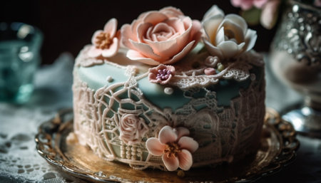 Ornate wedding cake with homemade chocolate icing and berry decoration generated by artificial intelligence