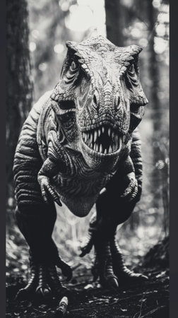 Close-up of a roaring T-rex, with its powerful jaws open, ready to strike, exemplifying the ferocity of the dinosaur era.