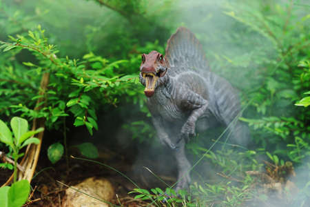 spinosaurus stands in a fog-covered forest. Spinosaurus was a really big dinosaur eating meat