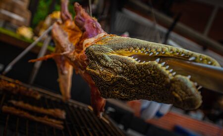 Close up of grilled whole crocodile at a food stall in the market in Bangkok, Thailand