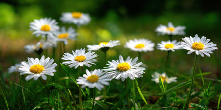 Blooming white daisy flowers creating a vibrant scene in a field surrounded by lush, dark green grass and sturdy stems