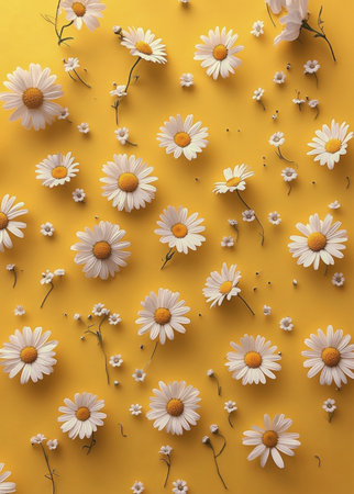 A vibrant display of white daisies and small flowers scattered across a sunny yellow background creates a joyful atmosphere. This design is perfect for spring-themed decor.