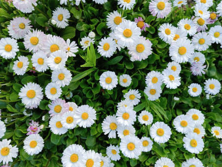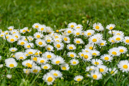 Many white daisies on a meadow. Bellis perennis - Group of daisies on springtime.