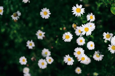 Chamomile field, top view. Beautiful spring chamomile flowers. Collection of medicinal herbs