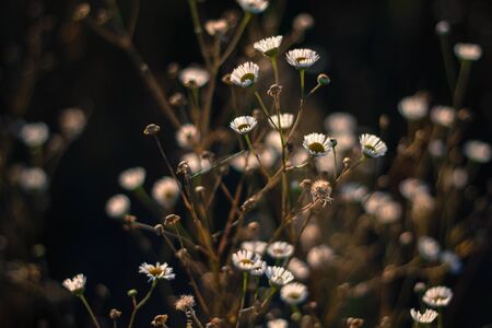 Tranquil scene of white daisies with a moody, vintage filter in a meadow at twilight