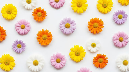 A cheerful arrangement of colorful daisy-like flowers in yellow, orange, pink, purple, and white are scattered on a clean white background.