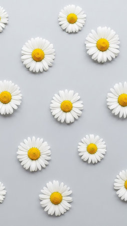 A vertical arrangement of white daisy flowers with bright yellow centers, scattered evenly across a soft light gray background, creating a fresh and clean pattern.