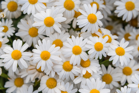 Field of white daisies with yellow centers. The daisies are scattered throughout the field