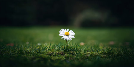 A single daisy blossoms brightly in a lush green meadow, with a soft focus background