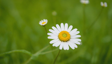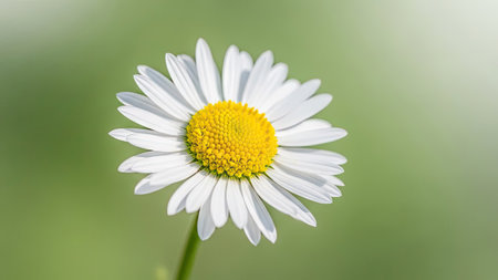 A close-up captures a daisy flower with white petals surrounding a bright yellow center. The composition features a blurred green background, suggesting an outdoor setting with natural light. The image may be suitable for botanical illustrations, educational materials, or various commercial projects seeking natural imagery.