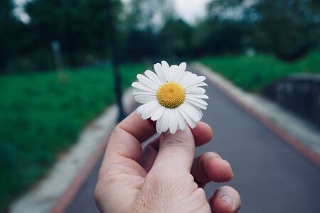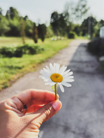 A hand holding a single white daisy flower against a blurred summer garden path, symbolizing simplicity and peace, nature concept.