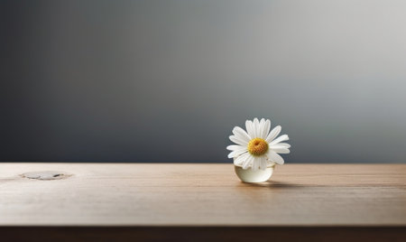 A single white daisy with a yellow center rests on a white surface, bathed in soft, diffused light, creating a serene and minimalist composition.