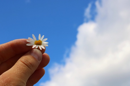 A man holding a Daisy in his hands. White clouds
