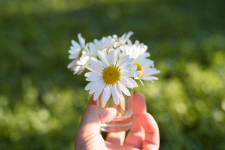 Bouquet of white chamomiles in hand on the green meadow background