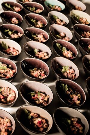 Fish tartar. Tuna and meat tartar in a mini dish. tartare with microgreens in a mini dish