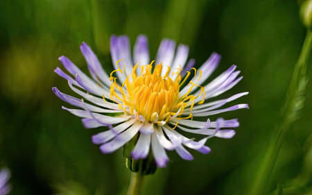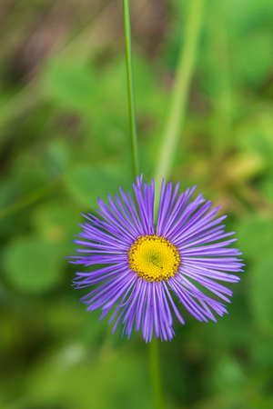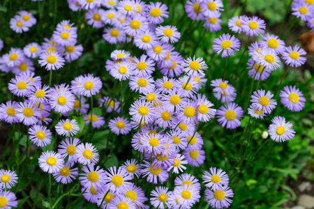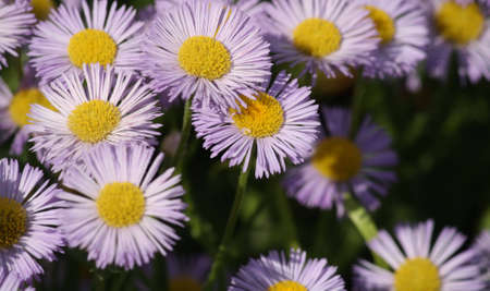 Blooming Erigeron speciosus flower close up on nice spring day. Ornamental flowering. Summer blooms - June July Blooms in lavender blue flowers with yellow disc.