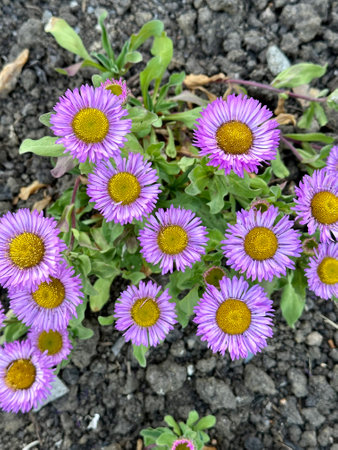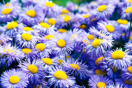 Purple daisies on the ground in the garden. Top view.