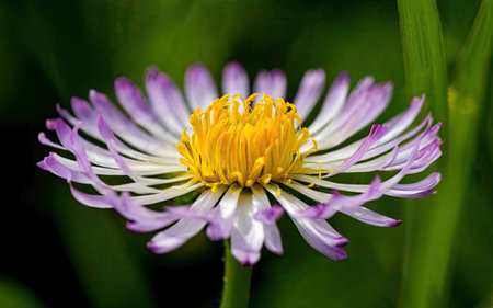 Perennial daisy or Bellis perennis on blur background in a garden