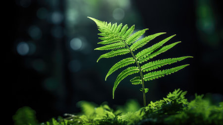 Close-up captures vibrant green fern fronds against a dark, blurred backdrop
