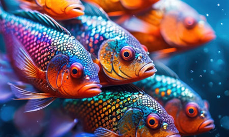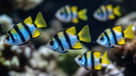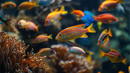 School of fish swimming in tropical reef, beauty in nature generated by artificial intelligence