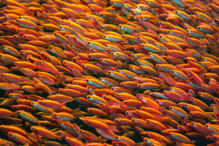 Shoal of vibrant colorful fish swimming together